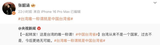 众多台湾艺人在社交媒体平台转发以中国二字、五星和台湾岛作为设计主体,配合“台湾必归”文案的海报,并带着#中国台湾省#话题表达对中华儿女身份的认同。