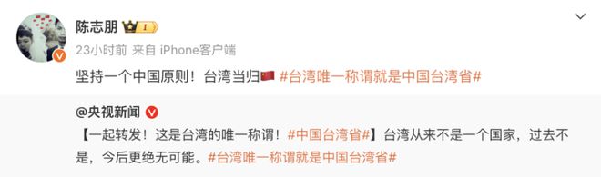 众多台湾艺人在社交媒体平台转发以中国二字、五星和台湾岛作为设计主体,配合“台湾必归”文案的海报,并带着#中国台湾省#话题表达对中华儿女身份的认同。